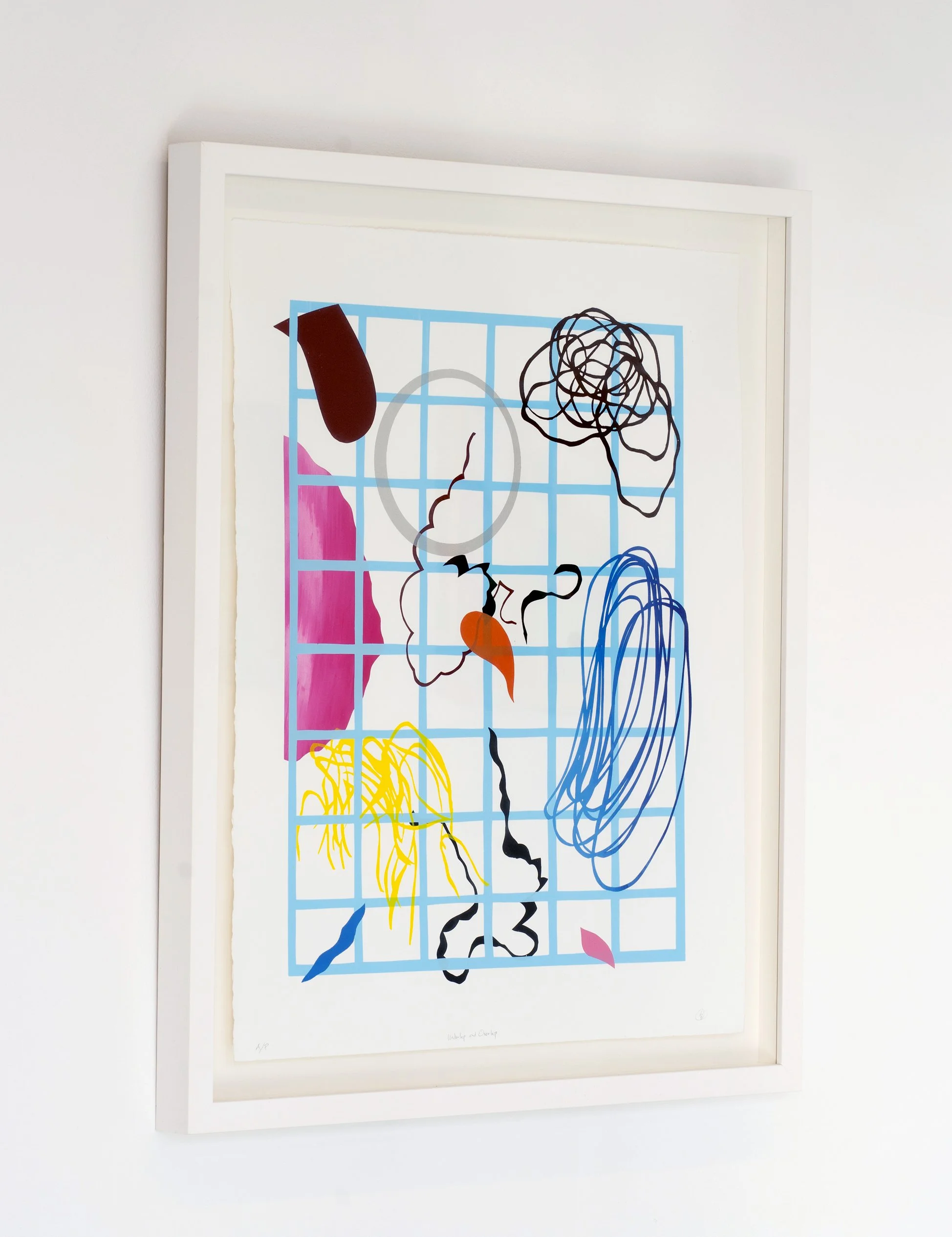Underlap and Overlap, a small edition silkscreen was developed alongside the works in this exhibition and extends my use of the grid as a compositional tool. Here, the grid operates as both structure and surface—sometimes singular, sometimes all-over—while shapes are woven through it to create depth, rhythm, and movement.