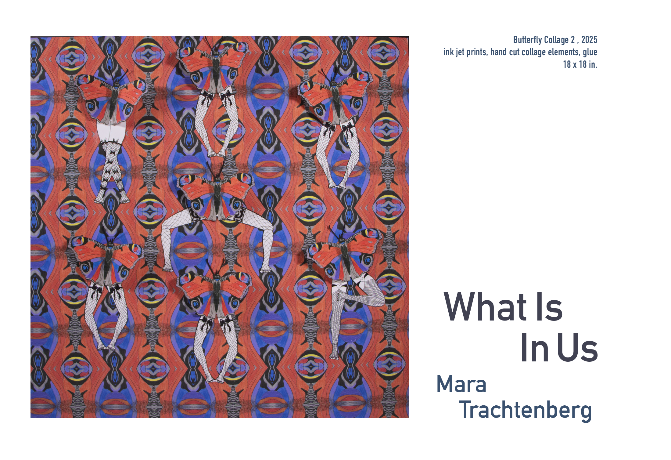 Mara Trachtenberg’s exhibition is an immersive installation of animation, collage and sculpture. Blending hand-cut analog with digital processes, Trachenberg has created a new stop-go animation as well as collages with kaleidoscopic wallpaper designs that both camouflage and reveal troupes of hybridized pollinator-insect / humanoid dancers in various formations. Suspended from the ceiling are larger-than-life paper-mache chrysalis forms outfitted with clusters of miniature mirrors and small motors, doubling as disco-balls. These works are propelled by foundational childhood memories the artist cultivated watching dancers on TV in her family’s living room.